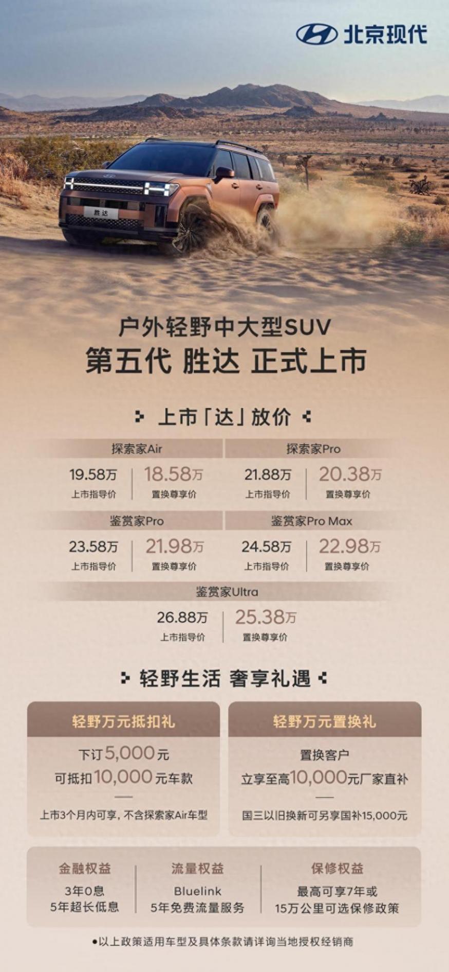 8月30日,北京現代全新旗艦SUV第五代勝達在成都國際車展正式上市,官方指導售價區間為19.58萬元-26.88萬元。新車提供探索家版和鑒賞家版兩個版本,并有熾霞橙、大地棕、叢林綠、深湖藍等八種低飽和度自然系配色可供選擇。同時,北京現代還特別為用戶準備了最高價值10,000元的輕野生活奢享購車禮遇。