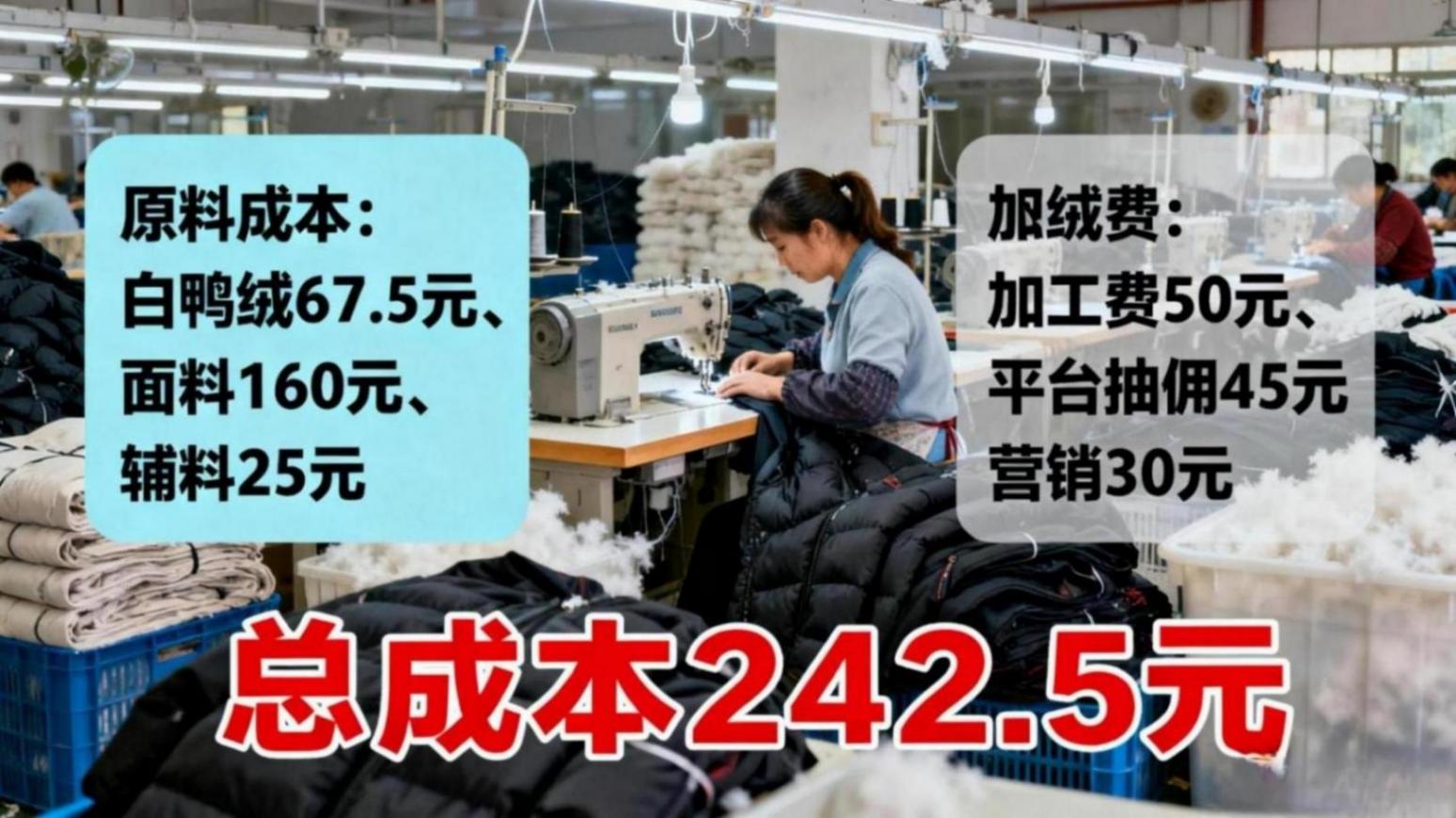 再算上其他開支:防鉆絨面料每米80元,一件衣服需2米;YKK拉鏈、按扣等輔料約25元;熟練工加工費50元/件,加上倉儲、物流、稅費,出廠成本已達242.5元。若進入電商平臺,平臺抽傭15%、營銷推廣占10%,終端售價低于300元,商家要么虧本,要么只能造假。