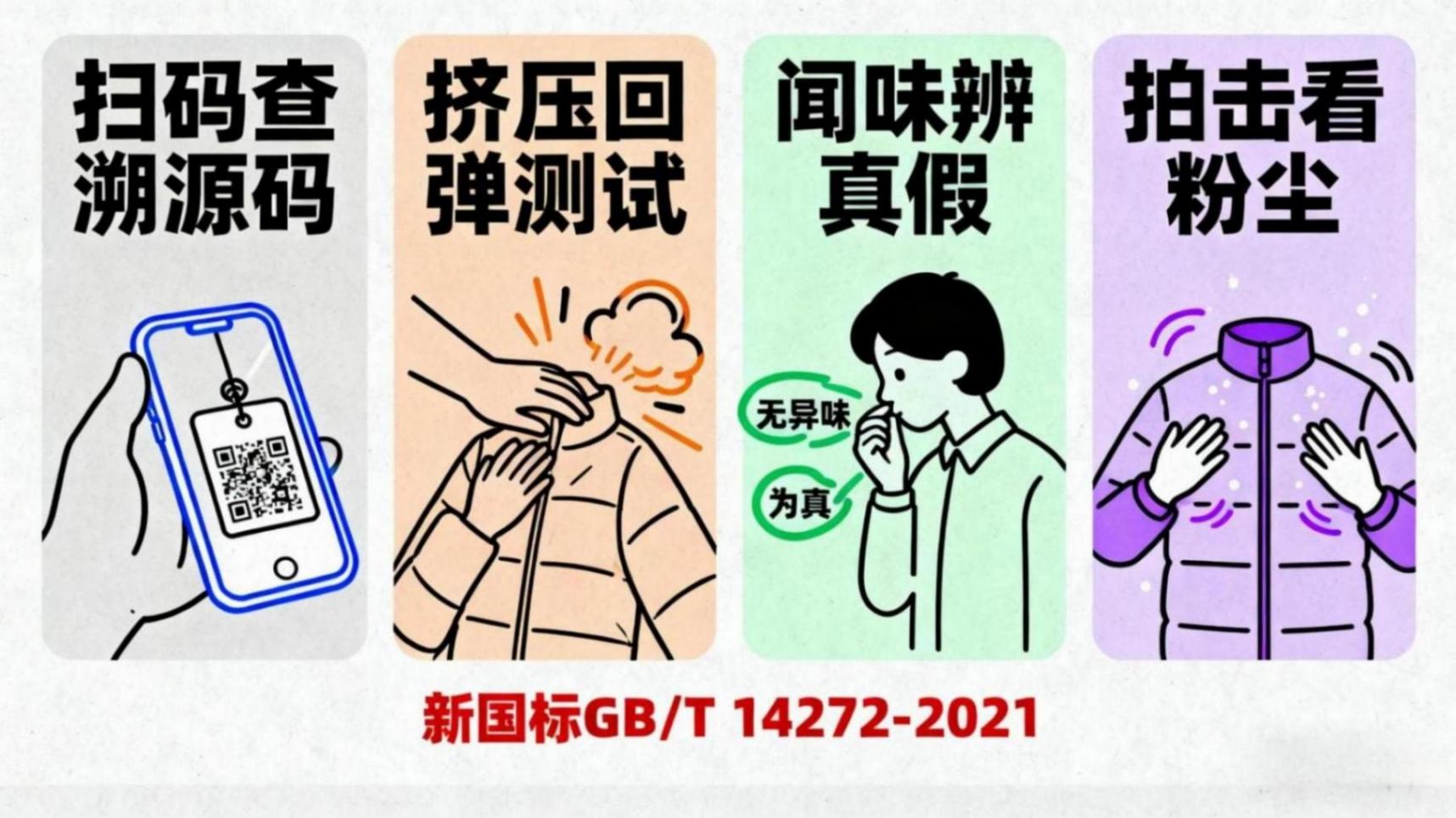 2025年起,絨子含量≥70%的羽絨服必須貼溯源碼,掃碼可查原料批次和檢測報告。標簽重點看兩項:一是執行標準GB/T 14272-2021,二是絨子含量≥50%(低于這個數不算羽絨服)。若寫著“羽絨棉”“羽絲絨”,直接pass——這些都是聚酯纖維,和羽絨毫無關系。