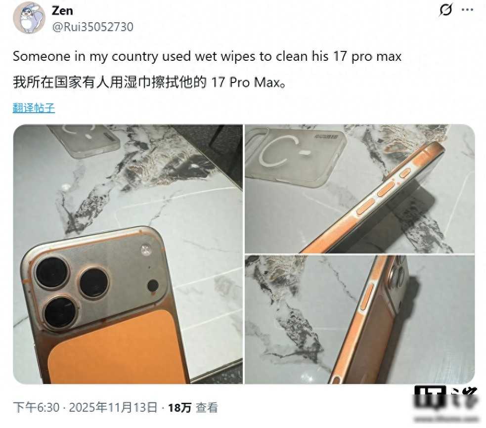 前幾天一位網友上傳了三張照片,他用的星宇橙配色iPhone 17 Pro Max手機,只是用濕巾擦了擦背殼,結果表面的涂層就成片脫落,露出底下銀灰色的金屬底色,這不是劃痕也不是正常使用造成的磨損,看起來確實讓人擔心,這個情況出現(xiàn)后,科技圈里很多人參與討論,有人推測是材料本身存在缺陷,也有人認為問題出在清潔方式上。