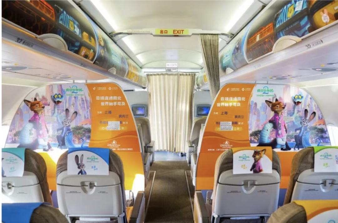 就連聚集了最多打工人的京滬航班也一掃班味兒,成了“痛機”。11月19日首映禮當天,東航的一趟航班專門換成了《瘋狂動物城2》主題的涂裝。機艙里,客座頭巾上印著所有知名的角色,包括朱迪、尼克、豹警官、貍寶、閃電。小桌板上印著上海迪士尼動物城的地圖。浦東機場T1航站樓的迪士尼商店旁,衛生間也悄然“變身”,不止有小型動物專用洗手間,還為他們分隔出了專用電梯。